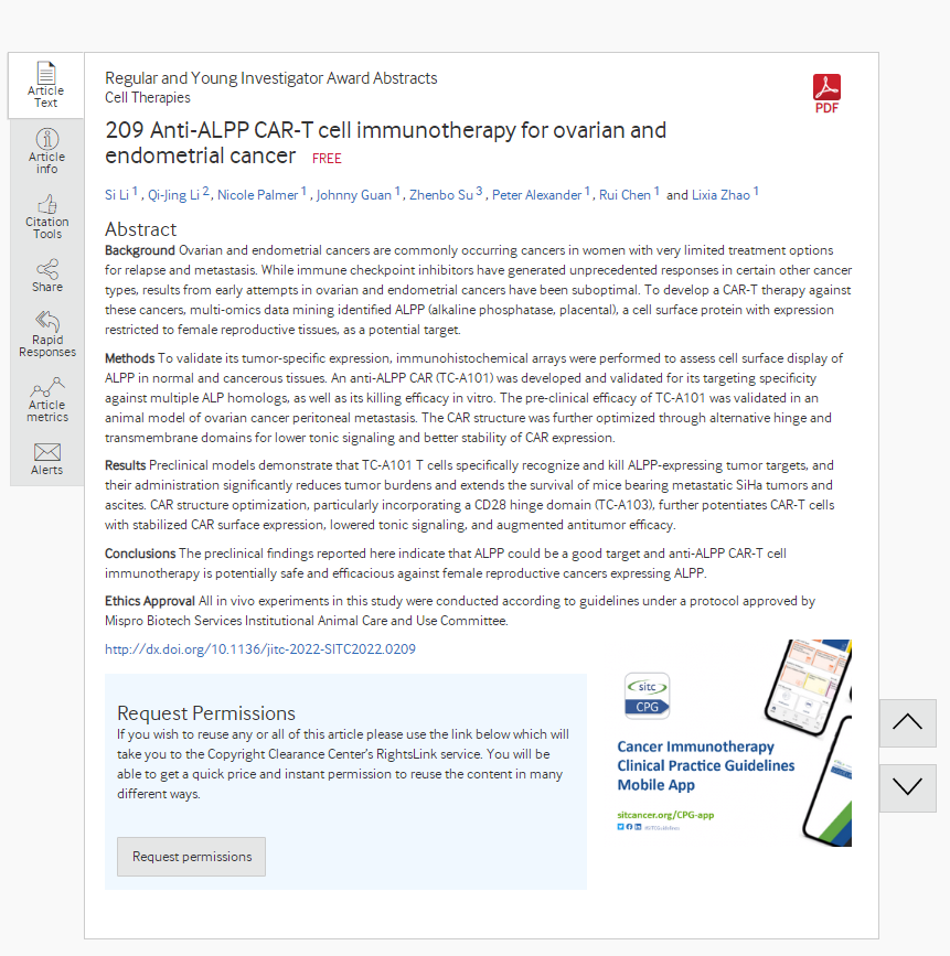 摘要標(biāo)題:Anti-ALPP CAR-T cell immunotherapy for ovarian and endometrial cancer 用于人體內(nèi)卵巢癌和子宮內(nèi)膜癌的抗 ALPP 的CAR-T 細(xì)胞免疫療法