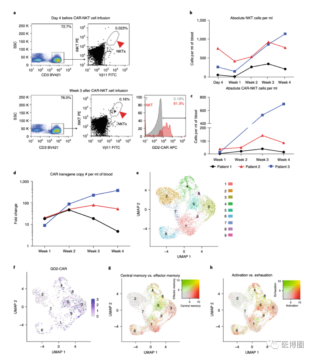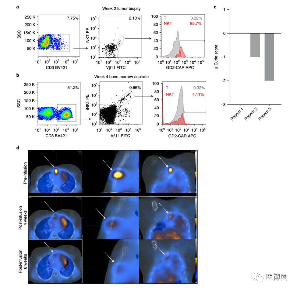 a 通過(guò)流氏細(xì)胞檢測(cè)技術(shù),病人3在輸入NKT細(xì)胞之前,之后的NKT細(xì)胞的比例,以及周邊血樣本GD2-CAR的表達(dá)。在輸入NKT細(xì)胞4天前的CAR-NKT細(xì)胞比例是0.023%,輸入CAR-NKT細(xì)胞3個(gè)星期之后,NKT細(xì)胞比例提升到了0.16%。柱形圖展現(xiàn)了在輸入NKT細(xì)胞三個(gè)星期之后,CAR的表達(dá)(紅色,61.3%)和陰性對(duì)照(灰色,0.19%)相比。